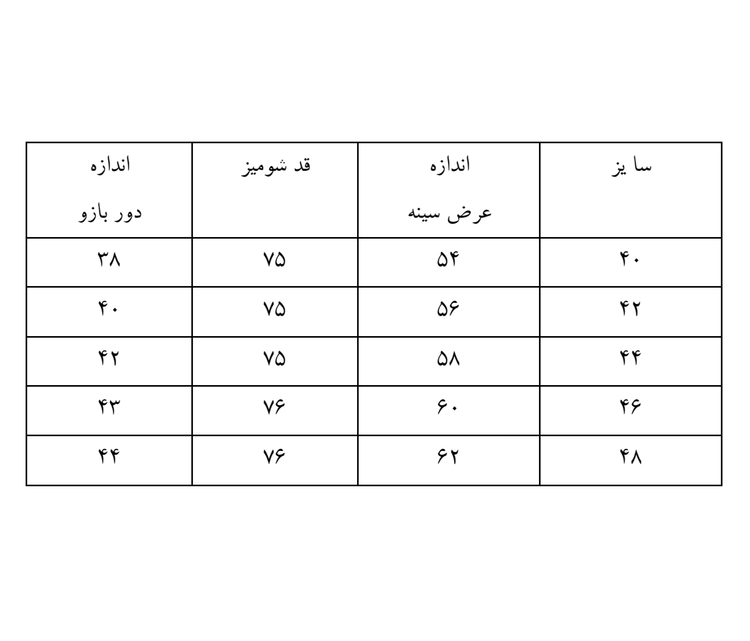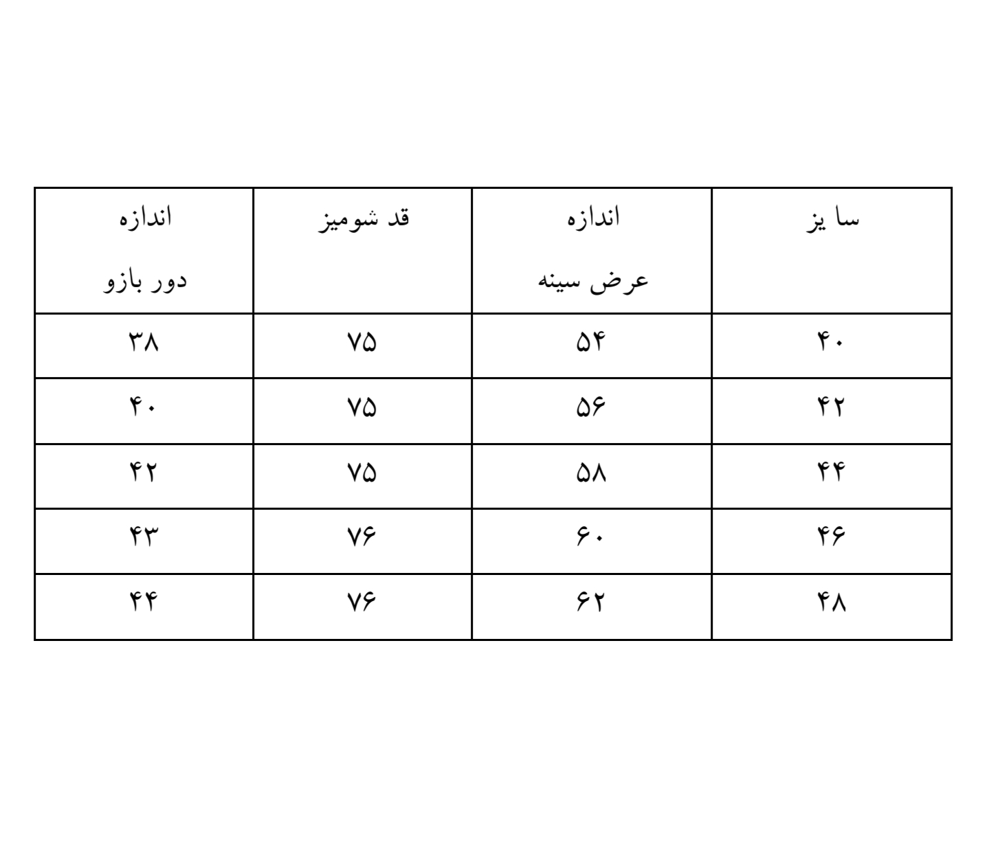 سایز ۴۰، سایز ۴۲، سایز ۴۴، سایز ۴۶، سایز ۴۸
